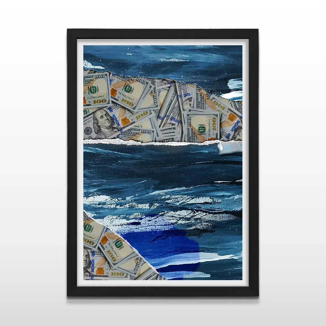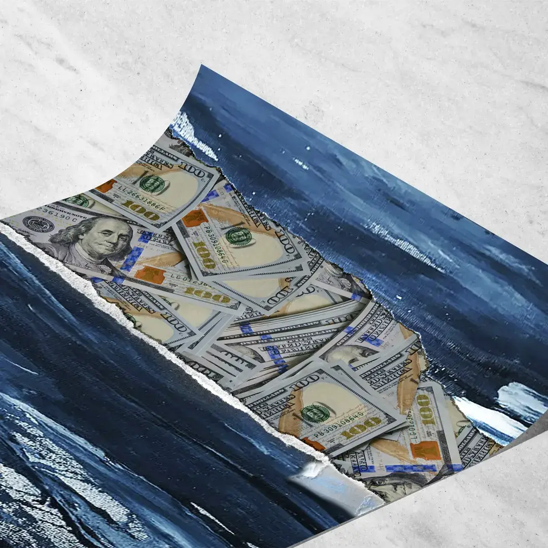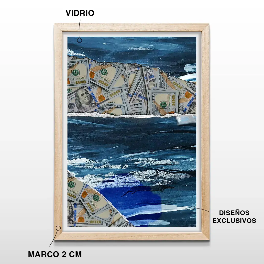 El cuadro decorativo Tesoro Escondido es una obra de arte moderno de enfoque conceptual que representa la prosperidad como un descubrimiento reservado para quienes saben mirar más allá de la superficie. La composición muestra un paisaje marino abstracto construido a partir de azules profundos y blancos en movimiento, donde el oleaje se abre de manera simbólica para revelar fajos de billetes de cien dólares ocultos bajo el agua, creando un contraste potente entre calma visual y ambición latente.