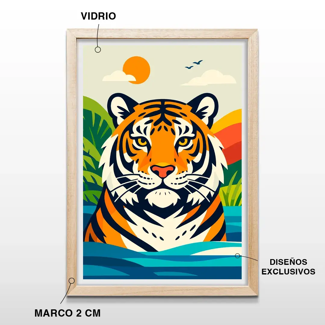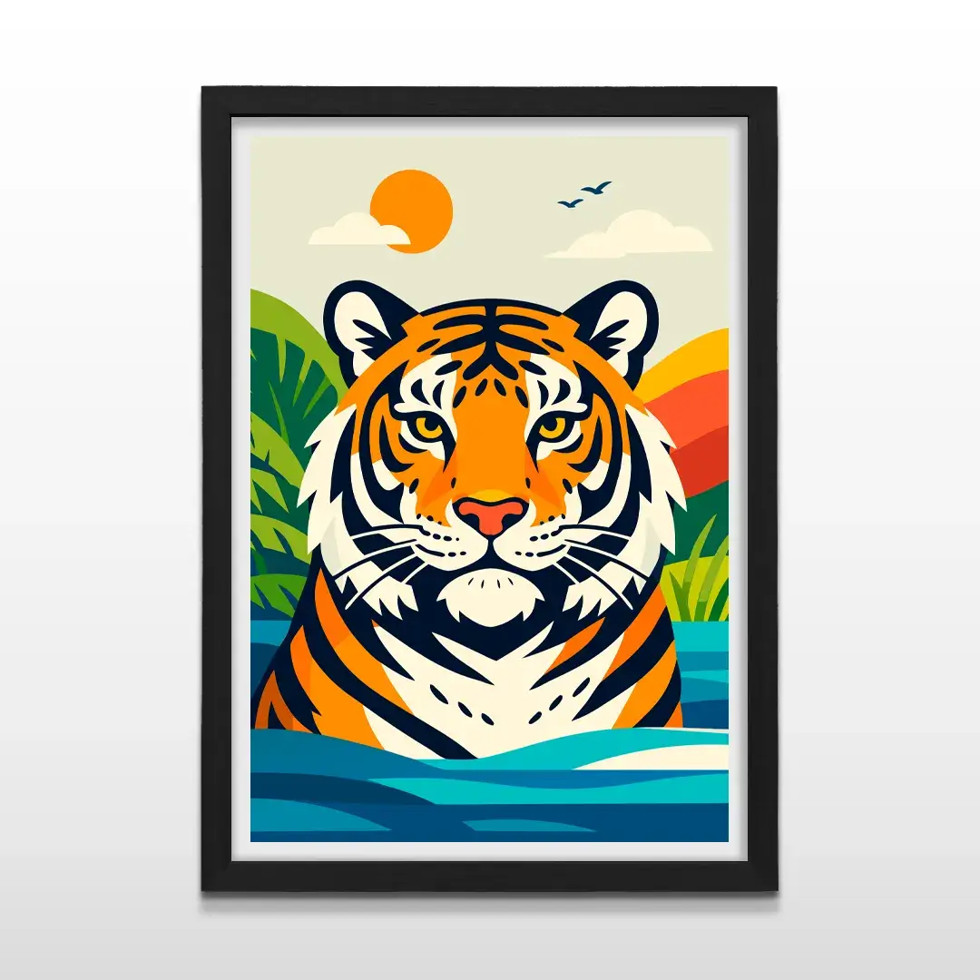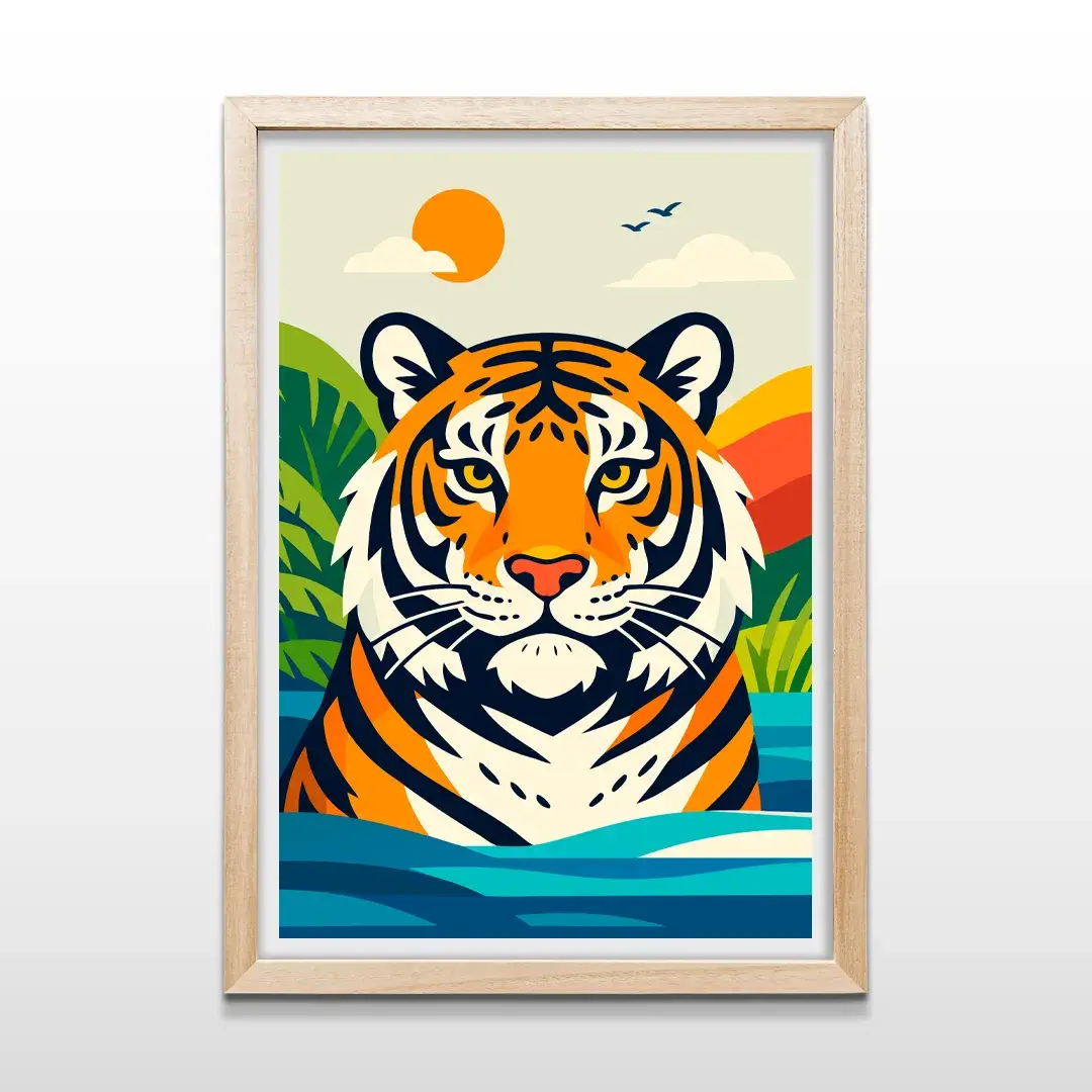 El cuadro decorativo Tigre de Bengala es una obra de arte gráfico que combina la majestuosidad del reino animal con un diseño contemporáneo de gran impacto. La composición presenta el busto imponente de un tigre de bengala creado con trazos geométricos precisos y colores vibrantes, emergiendo de aguas profundas bajo un sol radiante y rodeado de colinas tropicales.