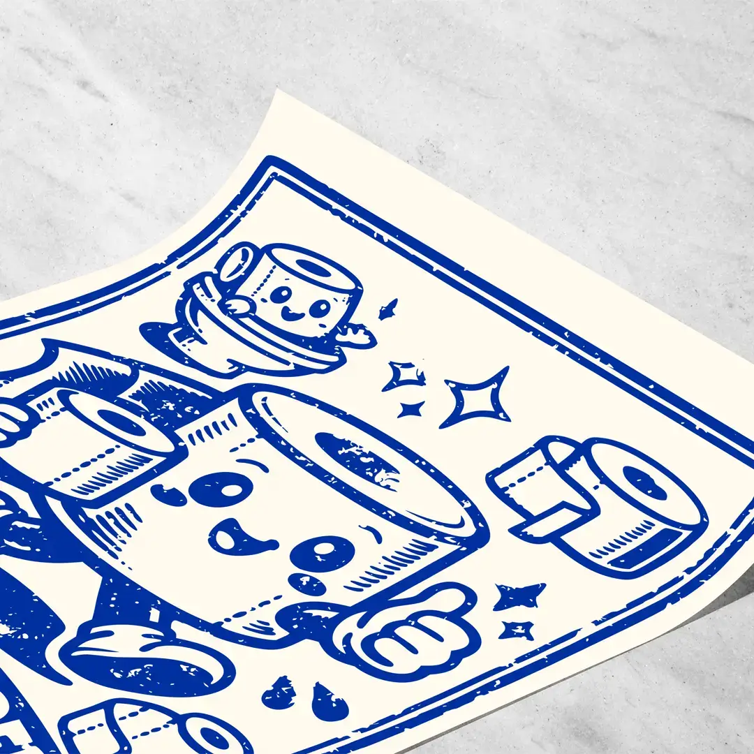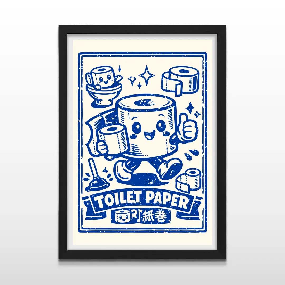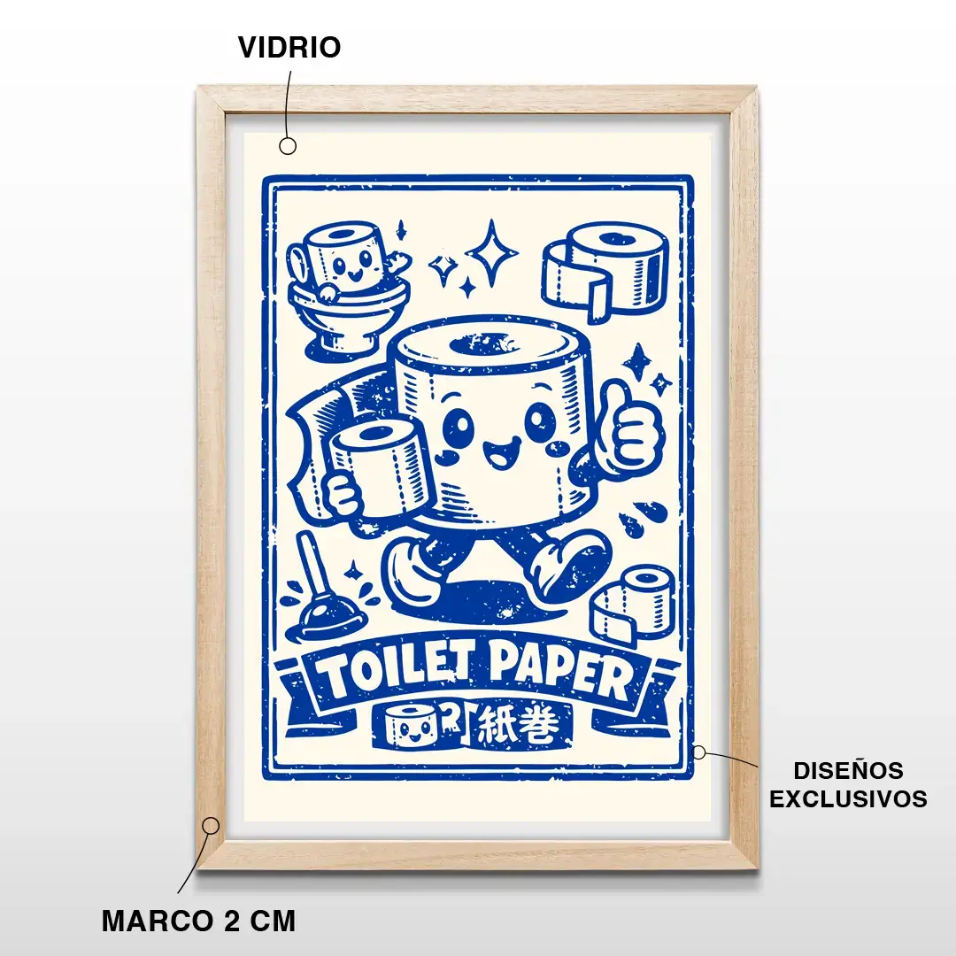El cuadro decorativo Toilet Paper apuesta por el humor gráfico con un personaje kawaii inspirado en la cultura pop japonesa: un rollo de papel higiénico ilustrado con expresión simpática, destellos brillantes y tipografía retro. La combinación de azul cobalto sobre fondo crema genera un contraste atractivo que capta miradas al instante.