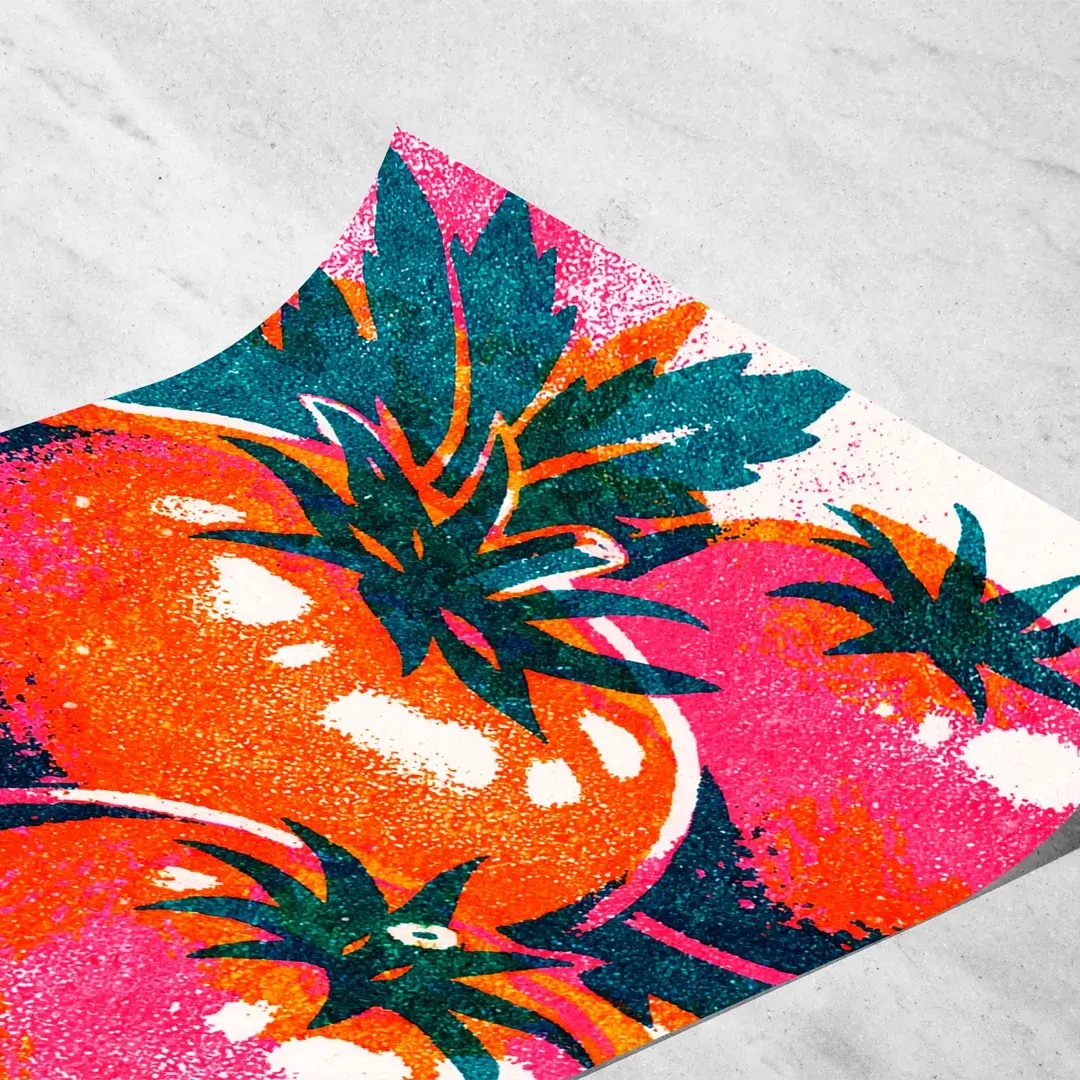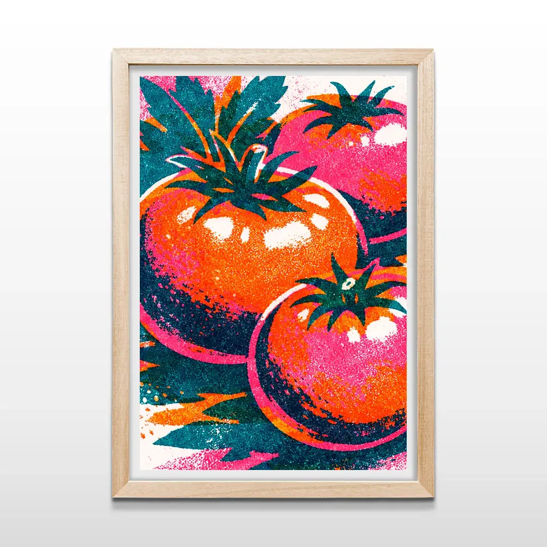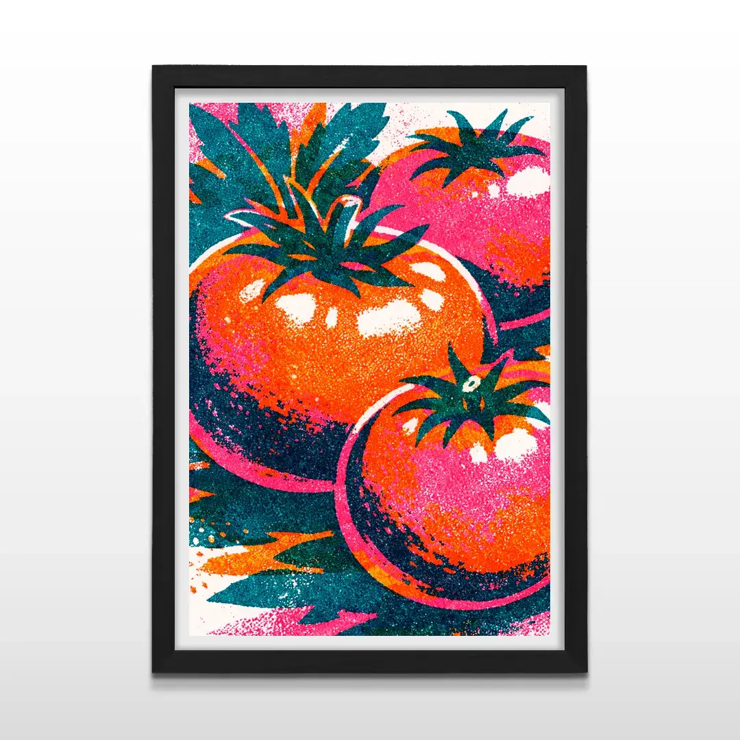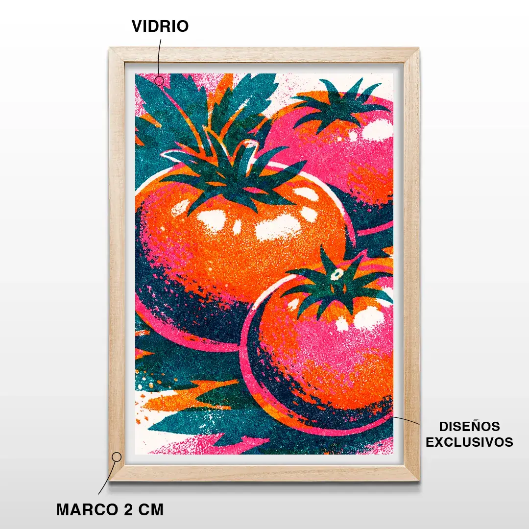 Este cuadro decorativo de tomates lleva un elemento cotidiano al centro de la escena a través de una mirada gráfica audaz. La ilustración, trabajada con una estética serigráfica de alto impacto, enfatiza las formas orgánicas y el rojo intenso del fruto, creando una composición vibrante que convierte lo simple en un recurso visual lleno de energía.