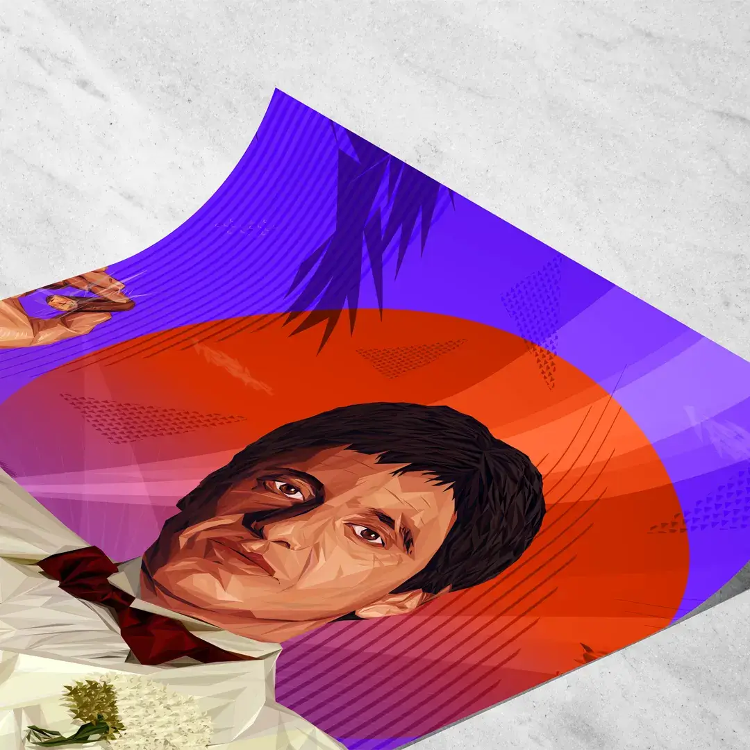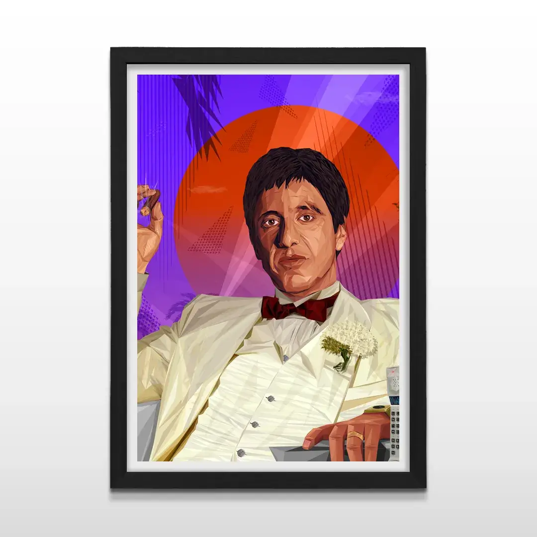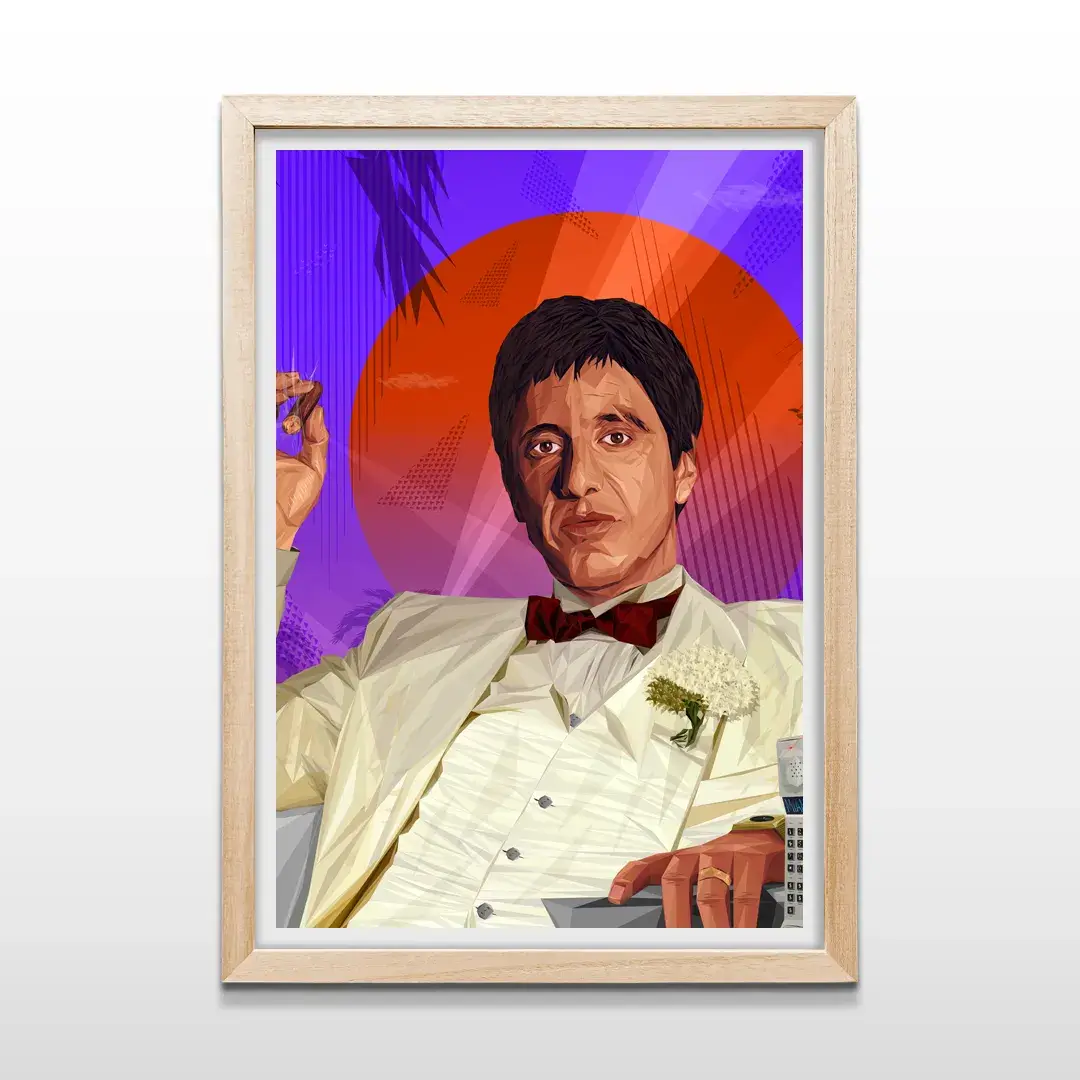 El cuadro decorativo Tony Montana es una obra de arte digital de estilo geométrico que reinterpreta uno de los íconos más poderosos del cine de culto. La figura del protagonista aparece con su clásico traje blanco y moño bordó, recortada sobre un fondo retro de atardecer tropical en tonos púrpuras y naranjas que evocan lujo, exceso y ambición. La composición combina estética cinematográfica y diseño moderno, logrando un impacto visual inmediato y reconocible.