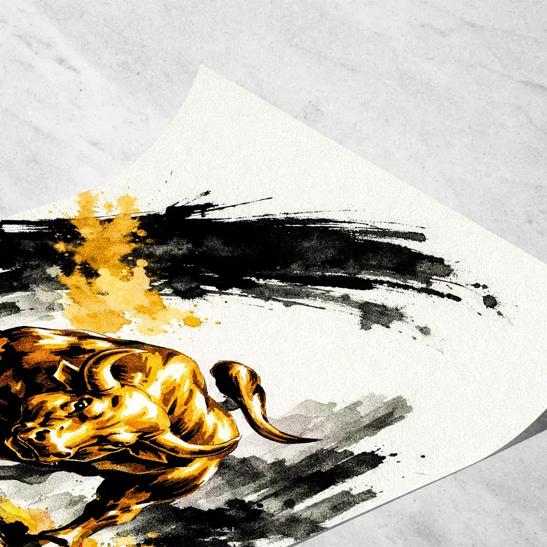El cuadro decorativo Toro De Oro es una obra de arte contemporáneo que transmite la fuerza y la energía de los mercados financieros alcistas. La icónica figura del toro de Wall Street emerge bañada en oro líquido sobre un fondo de pinceladas expresionistas en negro y ocre, simbolizando poder, determinación y riqueza.