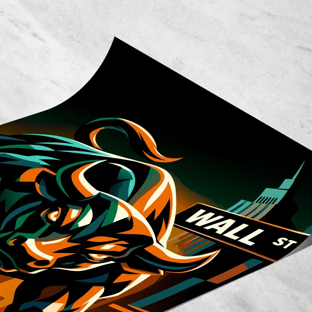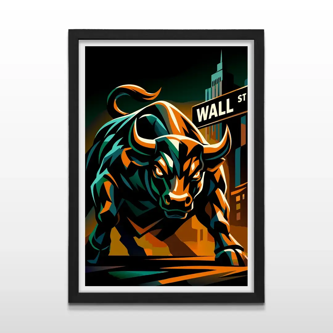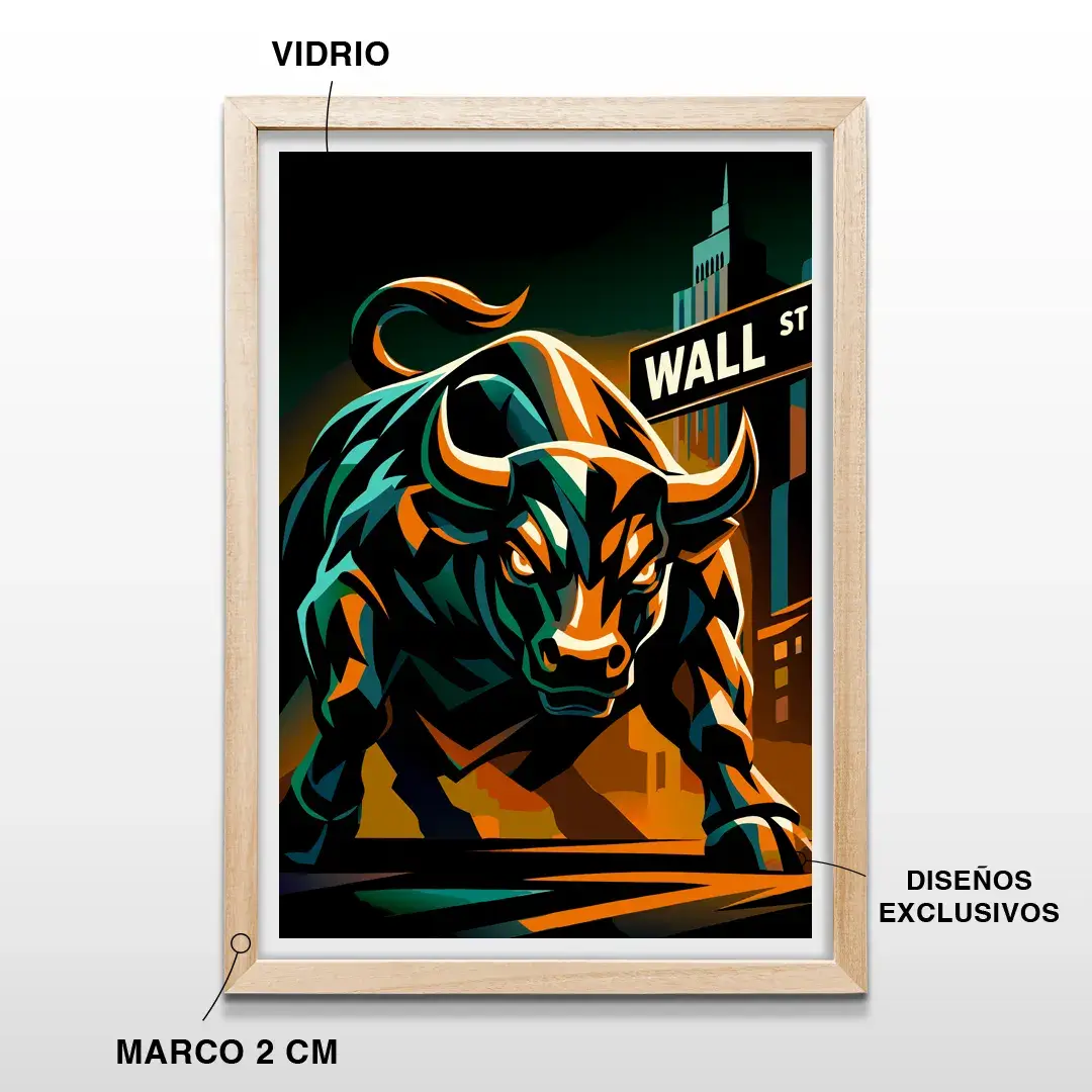 El cuadro decorativo Toro Wall St representa la fuerza alcista del mercado financiero a través de un diseño de alto impacto simbólico. La ilustración muestra al toro de Wall Street avanzando con potencia en tonos bronce y dorado metálico, destacándose frente al histórico cartel de Wall St y una ciudad nocturna iluminada, evocando determinación, crecimiento y dominio estratégico.