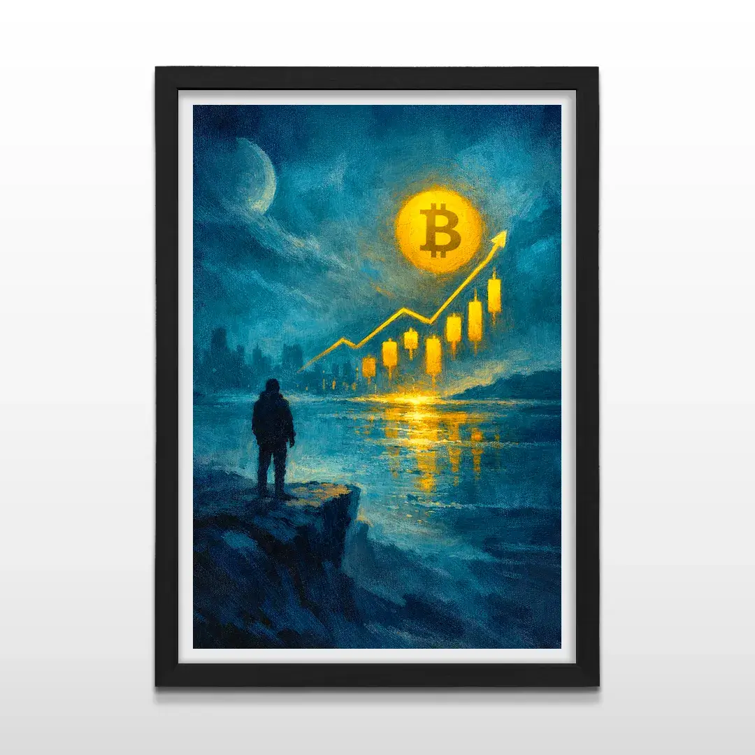 El cuadro decorativo Trader interpreta la figura del inversor moderno desde una mirada introspectiva y contemporánea, representando a un operador solitario que observa el ascenso de las velas de Bitcoin sobre un horizonte nocturno. La composición, trabajada con una estética impresionista y atmósfera serena, transmite enfoque, visión estratégica y una relación consciente con el riesgo, convirtiendo la escena en una metáfora visual del pensamiento a largo plazo.
