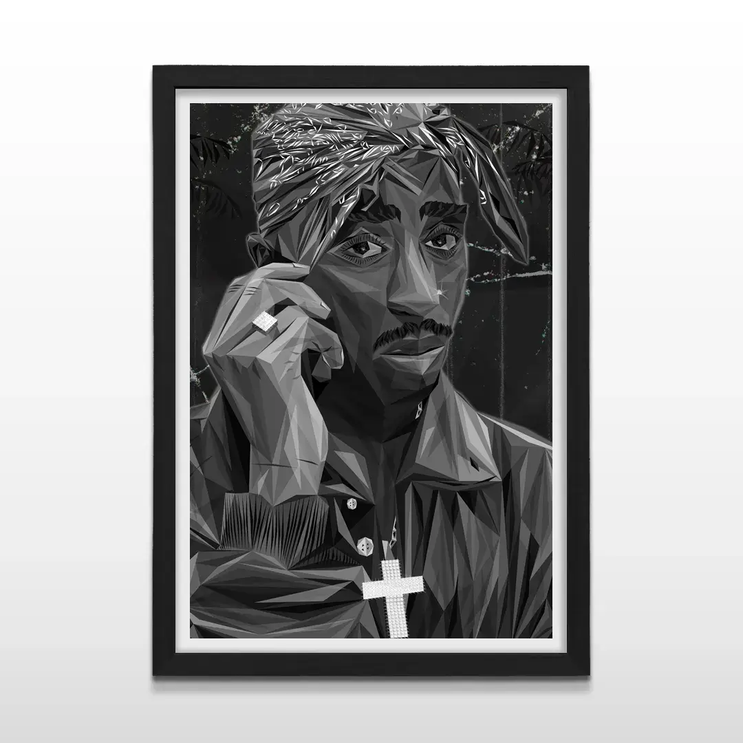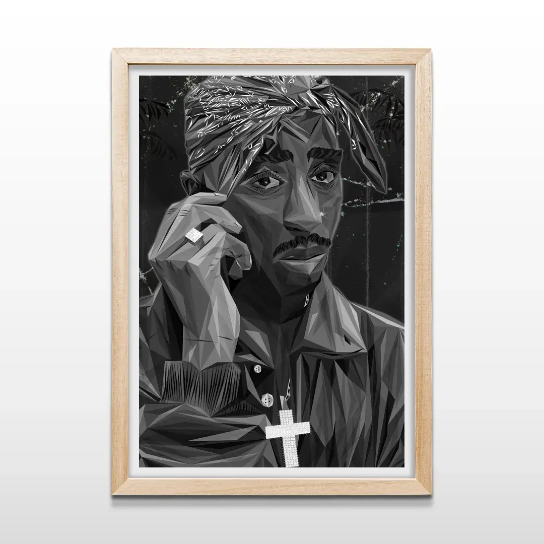 El cuadro decorativo Tupac es una obra de arte urbano contemporáneo que celebra la leyenda del hip hop. Presenta un retrato de Tupac Shakur en escala de grises, realizado con técnica geométrica low poly, donde cada faceta destaca su mirada intensa, el pañuelo característico y la cruz brillante, sobre un fondo oscuro con detalles sutiles de vegetación que aportan profundidad y contraste.