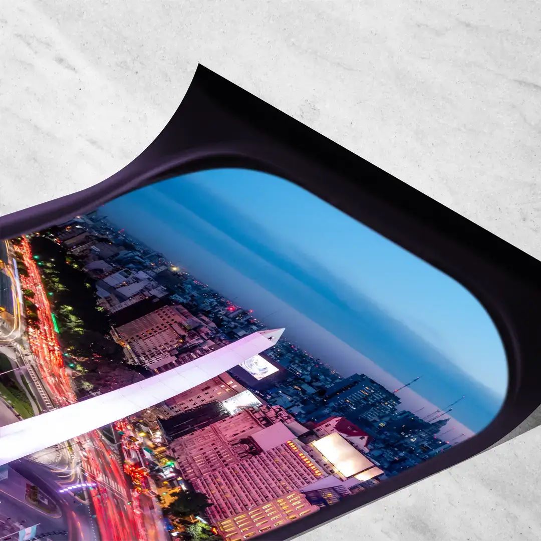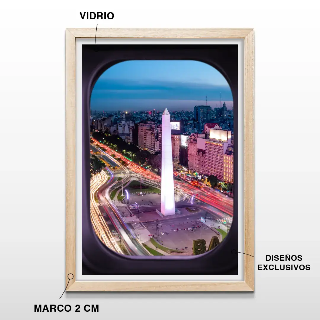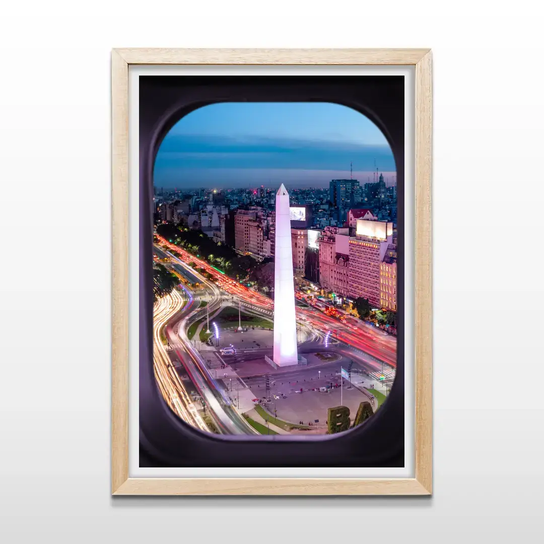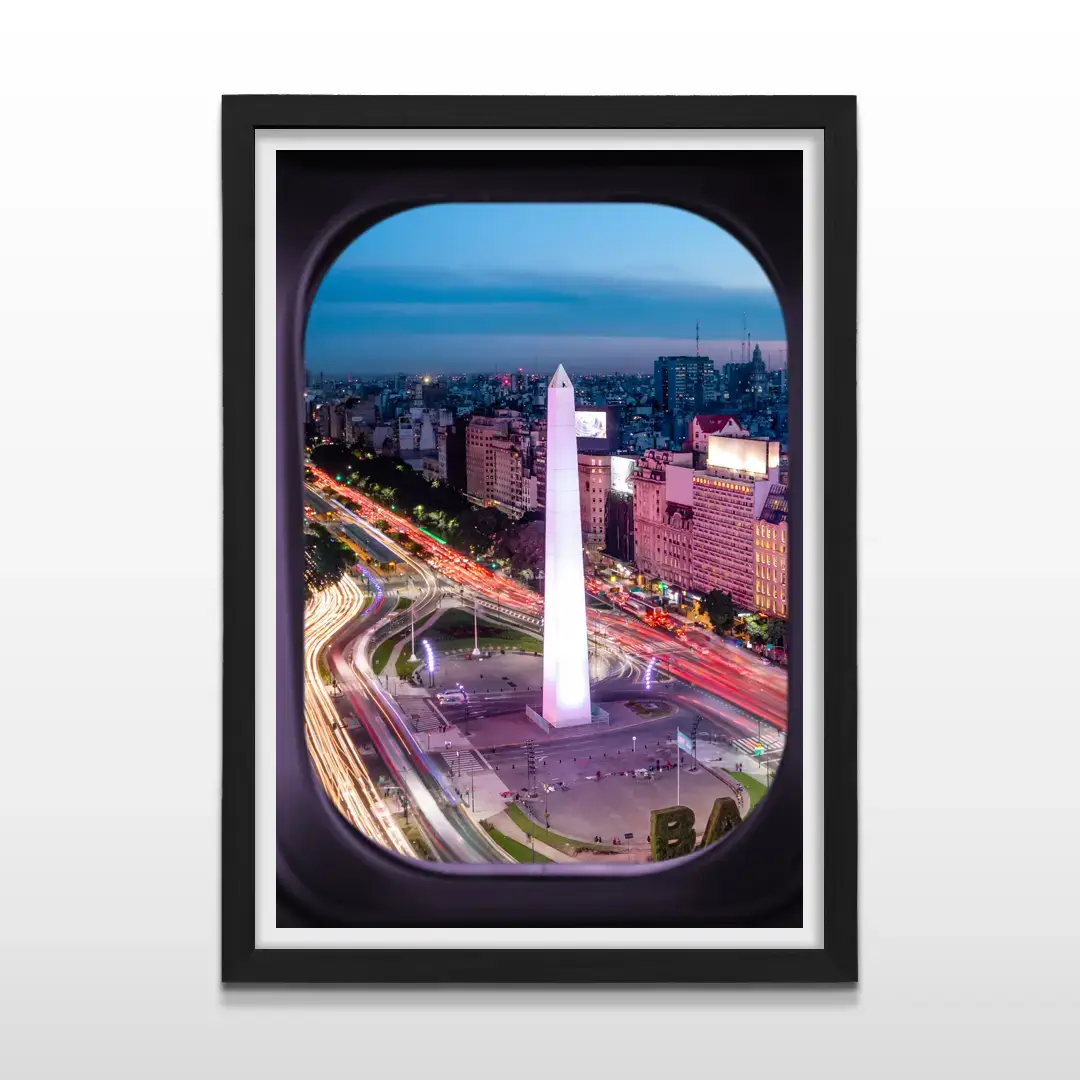 El cuadro decorativo Ventanilla de Avión Buenos Aires captura un instante cargado de emoción y pertenencia a través de una composición fotográfica de alto impacto visual. La imagen muestra la ciudad al atardecer desde la perspectiva íntima de una ventanilla de avión, con el Obelisco iluminado como eje central y la Avenida 9 de Julio desplegándose en líneas de luz que reflejan el pulso inconfundible de Buenos Aires.