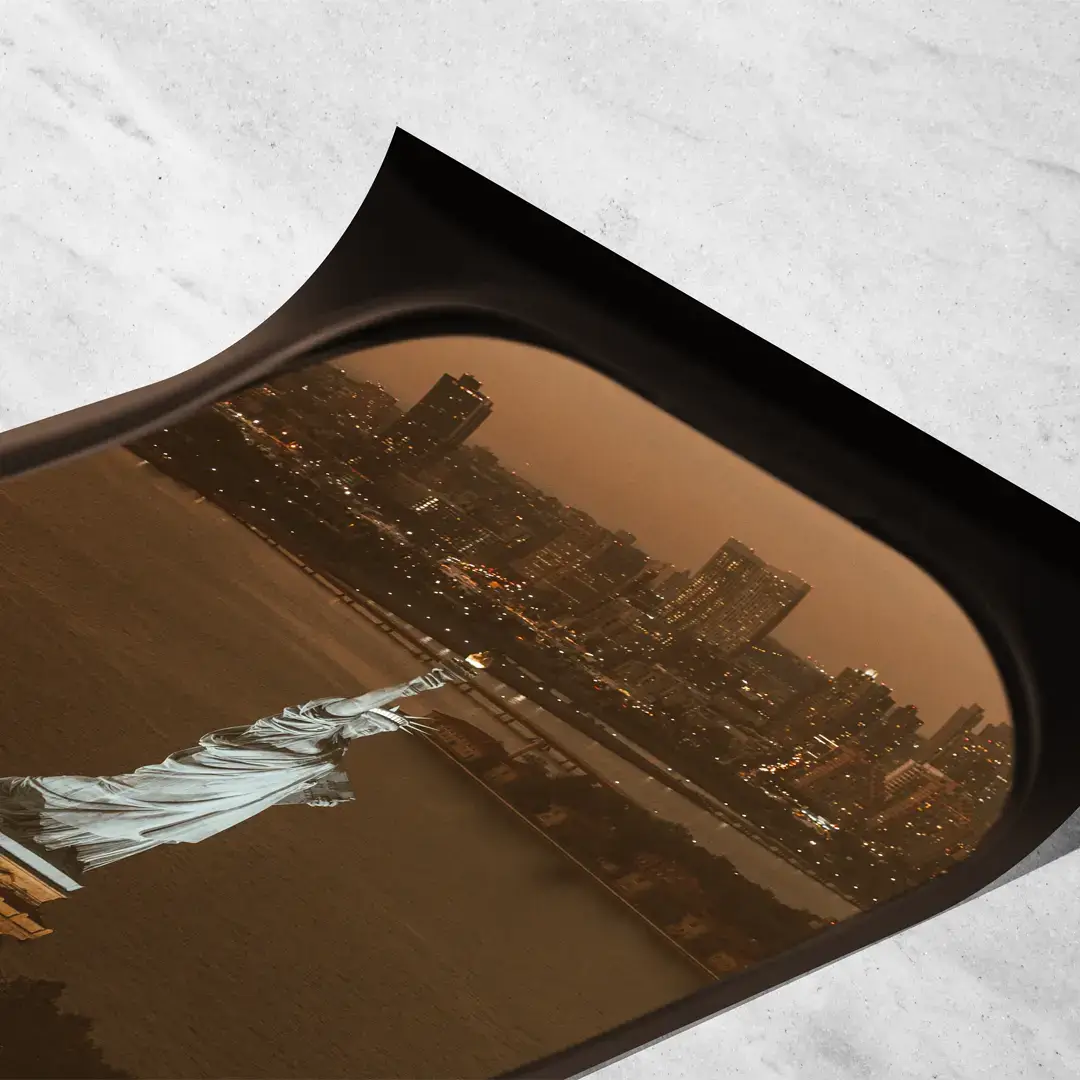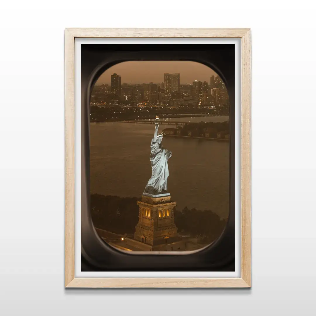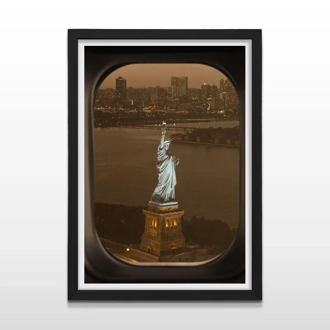 El cuadro decorativo Ventanilla de Avión Nueva York propone una escena de fuerte impacto aspiracional a través de una fotografía de estética cinematográfica y precisión urbana. La composición muestra la Estatua de la Libertad iluminada durante el atardecer, observada desde el marco íntimo de una ventanilla de avión, creando una narrativa visual ligada al viaje, la ambición y el comienzo de nuevas etapas.
