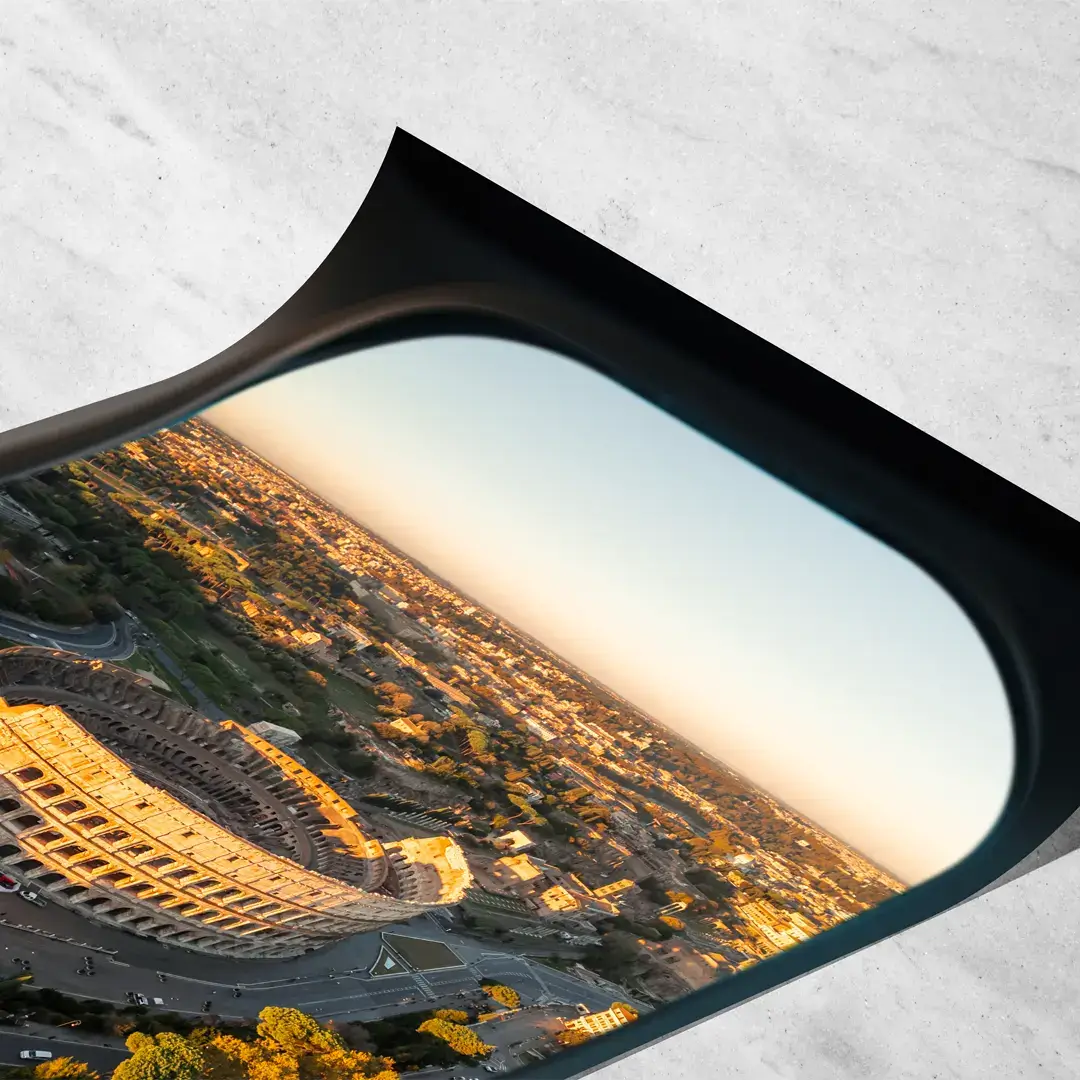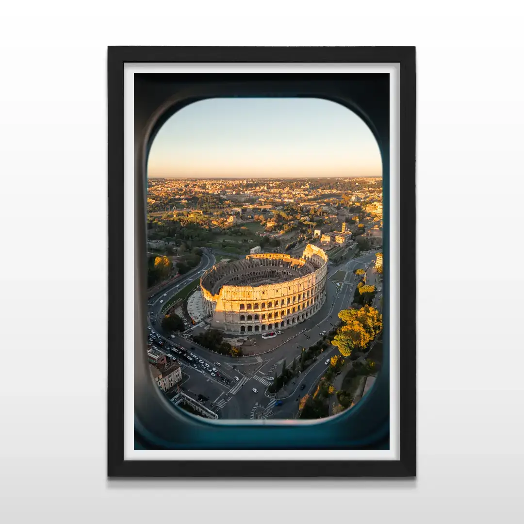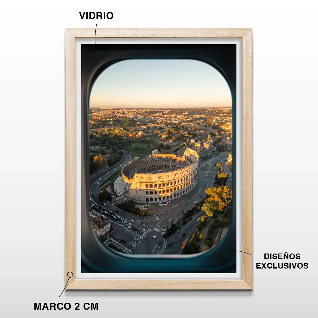 El cuadro decorativo Ventanilla de Avión Roma propone una lectura visual donde la historia milenaria se encuentra con la mirada del viajero contemporáneo, a través de una fotografía hiperrealista del Coliseo Romano iluminado por la luz cálida del atardecer. La escena, observada desde la perspectiva envolvente de una ventanilla de avión, genera una sensación de profundidad y tránsito permanente, como si el espectador estuviera a punto de aterrizar en la Ciudad Eterna.
